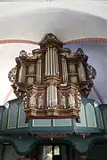 II/p | 13 | Création mit Haupt- und Brustwerk; Le postif de dos in der Brüstung est à trappe; Gehäuse mit originalen Prospektpfeifen erhalten, deren Eselsrücken-Labien auf ein älteres Datum hinweisen (probablement gothique tardif). ![]() |