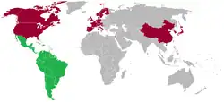 Le déclenchement de la Première Guerre mondiale en 1914 perturbe les investissements britanniques et européens en Amérique latine, et l'ordre économique international est bouleversé[91]. Dans la période qui suit la Première Guerre mondiale, l'Allemagne n'a plus de liens commerciaux avec l'Amérique latine et le Royaume-Uni subit des pertes considérables, laissant les États-Unis dans une position dominante.