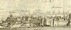 « En arrivant à Arles, il [ndlr : le légat Milon) a aperçu la forteresse de Guilhem Porcelet, bâtie sur deux églises et un cimetière dans une île du Rhône (ndlr : probablement, l'Île de la Cappe) ; cette munitio fortissimo servait de point de départ de ses pillages et de ses exactions : aussi le légat la fit-elle détruire.» - ↑ Augustin Fabre - Histoire de Provence – 1834, p. 100-101 :