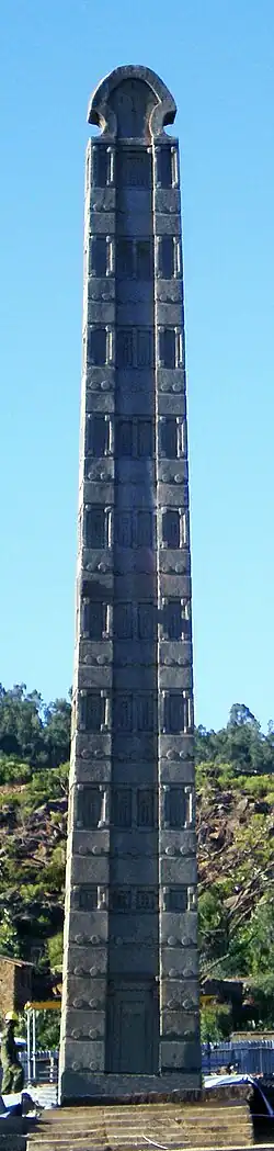 On dénombre dans la région du sud de l'Éthiopie la plus grande concentration de mégalithes de tout le continent africain[30]. Au nombre d'une centaine dans le Harar, d'autres plus récents (Ier millénaire de notre ère) se comptent par milliers dans le Choa et le Sidamo. L'une des régions les plus marquées par ce mégalithisme se trouve au sud d'Addis-Abeba, où quelque 160 sites archéologiques ont été découverts jusqu'à présent, celui de Tiya[31] est l'un des plus importants. Il comprend 36 monuments, dont 32 stèles présentant une figuration sculptée faite d'épées et de symboles demeurés énigmatiques.