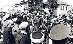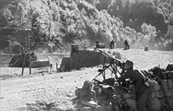 Tirana est libérée par les partisans le après une bataille de 20 jours. Les partisans libérèrent entièrement l'Albanie de l'occupation allemande le . L'Armée de libération nationale, composée en de 70 000 réguliers, prit également part à la guerre aux côtés de la coalition antifasciste. Les partisans albanais ont également aidé à la libération du Kosovo et aidé les forces communistes de Tito à libérer une partie du Monténégro et du sud de la Bosnie-Herzégovine[27]. À ce moment-là, l'armée soviétique entrait également dans la Yougoslavie voisine et l'armée allemande se retirait de la Grèce vers la Yougoslavie.