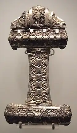 Les Vikings mènent des raids de pillage à partir de 795 et fondent les premiers centres urbains de l'île : Dublin, fondée en 841 et qui atteint plusieurs milliers d'habitants au XIIe siècle, Limerick, Wexford, Waterford et Cork. Leur pouvoir ne s'étend cependant que sur un arrière-pays très étroit et la plus grande partie de l'île leur échappe[19]. Ils sont désignés comme Gall, « étrangers », probablement du latin Gallus (Gaulois), ou comme Genti, « païens », ce dernier terme devenant moins fréquent avec la christianisation des Scandinaves. Malgré les échanges culturels et les intermariages, ils restent perçus comme étrangers après trois siècles de présence[27]. Olaf Kvaran, roi viking exilé d'York en Angleterre puis roi de Dublin de 953 à sa mort en 981, épouse successivement deux princesses irlandaises et nourrit à sa cour des poètes aussi bien norrois comme Thorgils Orraskald qu'irlandais comme Cináed ua hArtacáin (en). Sigtryggr Silkiskegg, roi de Dublin de 995 à 1036, est fils d'une princesse irlandaise et neveu du roi de Leinster Máel Mórda mac Murchada ; sa défaite à la bataille de Clontarf est présentée par l'épopée comme la « bataille des Irlandais contre les étrangers » (Cogadh Gaedhel re Gallaibh) et le poète irlandais aligne pas moins de 27 adjectifs péjoratifs contre les « Danois vociférants, odieux, empoisonneurs, meurtriers, hostiles, le cœur endurci, païens », etc., malgré le fait qu'il y avait des Irlandais et des Vikings dans les deux camps[28].