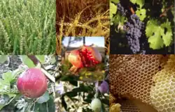 Les sept produits de la Terre Promise: «le pays qui porte blé, orge, vignes, figuiers, grenadiers, oliviers, une terre d'huile et de miel où le pain ne vous est pas mesuré». Deutéronome 8:8-9