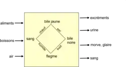Cette dimension théorique de la médecine savante hippocratique est exposée dans La Nature de l’homme[10]: le corps humain est considéré comme une « boîte noire »[11] avec des entrées (nourriture, boissons, air inspiré) et des sorties (urine, excréments, morve, expectorations, glaire, sang venant de saignement de nez ou de blessure). En l’absence de dissection humaine, les médecins s’appuient sur l’observation de ces flux d’entrée et de sortie, pour construire un modèle théorique hypothétique du corps humain, appelé théorie des quatre humeurs, donnant l’organisation de quatre fluides intérieurs en mouvement, allant de la tête vers le bas : le phlegme, le sang, la bile jaune, et la bile noire. La santé résulte d’un équilibre entre les humeurs et la maladie d’un excès ou insuffisance d’une humeur en un lieu donné. Certains organes (schêmata σχήματα) creux, comme la tête, la vessie, l’utérus, attirent, à la façon de ventouses, les humeurs du reste du corps (Ancienne médecine[12],[13], XXII, 5) ; d’autres, « spongieux et poreux telles que la rate, le poumon et les seins », absorbent seulement les liquides qui passent à proximité (XXII, 6). L’action thérapeutique va consister à diriger ses flux intérieurs vers d’autres lieux ou des portes de sortie. L’observation attentive des matières excrétées (vomis, excréments etc.) permettait de « voir » la pituite (phlegme) ou la bile rejetées. La pharmacopée hippocratique est en conséquence, très riche en remèdes purgatifs[n 2], diurétiques, vomitifs, expectorants, sternutatoires, sudorifiques, emménagogue etc. pour évacuer les humeurs nocives par les selles, l’urine, la bouche, le nez, les pores (des glandes sudoripares), l’utérus, etc. Primitivement, ils avaient pour rôle d’éliminer la maladie, considérée comme une impureté. Et comme le fait remarquer Jacques Jouanna[14], les mêmes termes (famille de kathairen καθαιρειν) sont employés en grec pour désigner la purgation et la purification. Dans les deux cas, il fallait éliminer une impureté. La langue garde ainsi la mémoire d'une unité primitive entre religion et médecine.