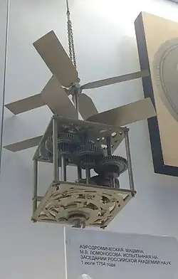 Il faudra attendre la fin du XVIIIe siècle pour qu'une véritable avancée se produise : en 1754 le Russe Lomonossov essaie devant un aréopage scientifique un modèle complexe à deux rotors coaxiaux contrarotatifs, mus par un mécanisme d'horlogerie, et démontre l'existence d'une force de sustentation. Le , les Français Claude Launoy et son mécanicien François Bienvenu font voler devant l'Académie royale des sciences un petit modèle très simple mû par un mécanisme de ressort à arc et deux rotors contrarotatifs réalisés en plumes d'oie. En 1828 un Italien, Vittorio Sarti, construit un modèle réduit doté de deux rotors tournant grâce à de la vapeur éjectée d'évents situés sur le mât.