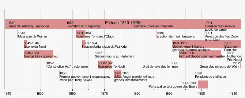 En 1854, le premier Parlement de Nouvelle-Zélande, établi par le Parlement britannique, à travers la New Zealand Constitution Act de 1852, conduit le pays vers une autonomie partielle, et vers la fin du siècle, elle sera entièrement autonome. Cette période verra une explosion démographique, puisqu'en 1870 la population non-Maori atteindra 250 000 alors qu'en 1853 elle était de 30 000[37].