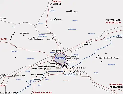 - fort de Planoise 1877-80. Il s'agit en fait d'un môle de résistance composé d'un réduit, d'un abri sous roc et de plusieurs batteries extérieures, le tout entouré d'une "enveloppe" (muraille basse). À cheval sur les communes de Besançon et Avanne-Aveney.