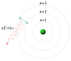 | 1913 | Niels Bohr | Afin d'expliquer la formule de Rydberg (1888), qui modélise correctement le spectre d'émission lumineuse de l'atome d'hydrogène, il suppose que les électrons négativement chargés tournent autour d'un noyau positivement chargé à certaines distances quantifiées fixes et que chacune de ces « orbites sphériques » possède une énergie associée telle que les mouvements électroniques entre les orbites nécessitent des émissions ou des absorptions quantifiées d'énergie. |