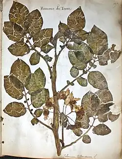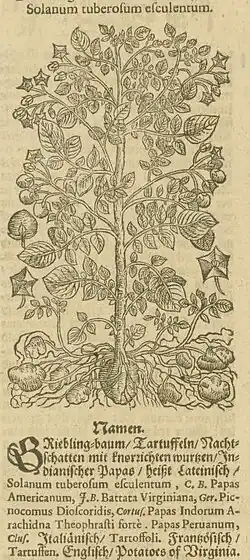 C'est au botaniste bâlois Gaspard Bauhin qu'on doit la première publication en 1596 d'une description botanique[N 6] dans son ouvrage Phytopinax seu Enumeratio plantarum[33] Il la rapproche des Solanum, « en raison de la ressemblance de ses feuilles et de ses fruits avec la Tomate, et de ses fleurs avec l’Aubergine, ainsi que pour sa semence qui est celle des Solanum, et pour son odeur forte qu’elle a de commun avec ces derniers » : il lui attribue le nom de Solanum tuberosum[34]. Il y cite aussi l'appellation italienne du tubercule Tarutffoli. Il étend le nom de laSolanum tuberosum en 1620 dans Prodromos Theatri Botanici[35], puis en 1623 dans Pinax theatri botanici, en Solanum tuberosum esculentum, (Morelle tubéreuse comestible)[36]. Ce nom, repris par la suite et abrégé en Solanum tuberosum selon la nomenclature binomiale par Linné dans son Species Plantarum publié en 1753, est encore aujourd'hui le nom scientifique de l'espèce[37]. Dans son Prodomos, où il propose la première représentation publiée en Europe de la pomme de terre, il écrit qu'on lui aurait rapporté qu'en Bourgogne les tubercules, accusés d'être vecteur de la lèpre[N 7], auraient vu leur usage interdit, ce qui ne sera pas sans conséquences sur l'avenir de la culture de la pomme de terre en France.
