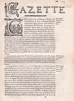 La première gazette hebdomadaire imprimée au monde, un journal de quatre pages intitulé Relation aller Fürnemmen und gedenckwürdigen Historien (« Communication de toutes histoires importantes et mémorables »), fut lancée à Strasbourg en 1605 par Johann Carolus[4]. Dès 1610, un annuel paraît en France : le Mercure François, édité par Jean et Étienne Richer. Il contient sur plus de 1 000 pages, des nouvelles du monde, de l'Europe et de France. C'est l'ancêtre de la presse française.