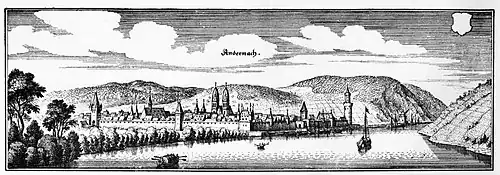 - (de) Cet article est partiellement ou en totalité issu de l’article de Wikipédia en allemand intitulé « Geschichte der Stadt Andernach » (voir la liste des auteurs).