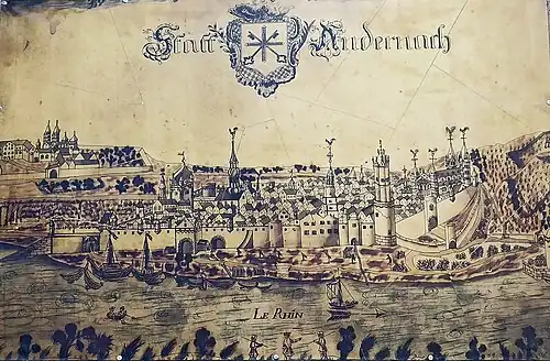 La porte de l'église possédait une fortification en demi-lune à deux branches. C'était une porte double avec deux maisons de gardiens, dont la première à proximité immédiate de la douve avec un pont. Ces deux maisons étaient attachées, chacune à un double mur. La porte des grains (Kornpforte) du côté Rhin avait également deux maisons de gardiens, l'une à l'arrière dans la perspective du mur, et la deuxième en tant qu'imposante fortification à l'avant, flanquée par les bretèches dans le mur vers l'ouest et vers l'est. Cette Kornpforte était l'accès principal à la ville, comme le montre la gravure de Matthäus Merian datant de 1646. La fortification bastionnée allait jusqu'au fleuve, qui, à l'époque, atteignit le mur d'enceinte, de façon à ne pas permettre un accès par le nord. La rive du Rhin jusqu'à l'ancienne grue dans l'ouest avait la fonction d'un port fluvial. Il est à souligner qu'il y a eu des changements importants au fil des siècles, notamment dans les zones près du Rhin.