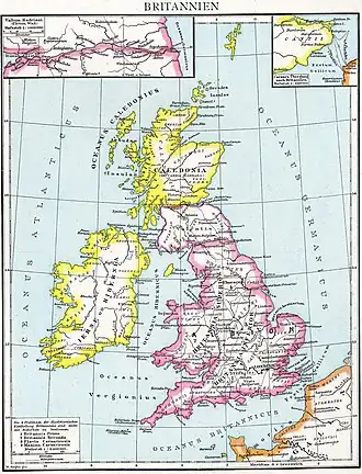 Selon la tradition gréco-romaine, Pythéas de Massilia a visité les îles Britanniques lors de ses voyages dans l'Atlantique (c. 310 – c. 306 av. J.-C.). Pythéas a écrit une description des îles Britanniques dans son ouvrage - aujourd'hui perdu - que des auteurs classiques ultérieurs ont cité, bien qu'ils doutaient de certains de ses contenus[7]. Pythéas fut le premier à décrire les îles britanniques en grec[8]. La description de Pythéas de la Grande-Bretagne comme une île triangulaire était très influente : il a décrit ses trois points comme « Kantion » au sud-est, « Belerion » au sud-ouest et « Orkadion » à l'extrémité nord[8]. Ces toponymes sont probablement à identifier avec le Kent (habité par les Cantii), avec la péninsule de Lizard en Cornouailles, et avec Dunnet Head à Caithness (en face des Orcades)[8].
