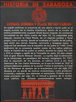 De la communauté juive de Saragosse, il ne reste que les bains rituels du XIIIe siècle trouvés dans le sous-sol d'un immeuble moderne dans la rue Coso (no 126-132), composés de nombreux arcades soutenues par des colonnes, utilisés comme synagogue, hôpital, boucherie et prison dont le terrain est occupé maintenant par le Séminaire de San Carlos. Il s'étend sur les actuelles rues Don Jaime, Veronica, place San Pedro Nolasco, rue Santo Dominguito, place San Carlos et rue de San Jorge[34].