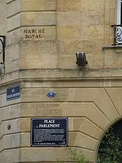 Plaque sur la façade de l'immeuble 1 place du Parlement à Bordeaux