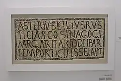 D'autres communautés juives sont attestées par des références épigraphiques ou littéraires à Utique, Chemtou, Hadrumète ou Thusuros (actuelle Tozeur)[51]. Comme les autres Juifs de l'empire, ceux de l'Afrique romaine sont romanisés de plus ou moins longue date, portent des noms latins ou latinisés, arborent la toge et parlent le latin, même s'ils conservent la connaissance du grec, langue de la diaspora juive à l'époque[52].