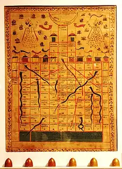 Un autre jeu indien adopté par l'Occident est le Gyan chaupar, populairement connu sous le nom de serpents et d'échelles. C'est un jeu qui est originellement destiné à enseigner des leçons sur le karma et les bonnes et mauvaises actions, les échelles représentaient les vertus et les serpents des vices. La leçon morale du jeu est que la libération spirituelle, ou Moksha, ne peut être obtenue que par une action vertueuse, tandis que le vice conduit à une réincarnation sans fin. Le jeu date de l'Inde médiévale où il est joué par des jaïns et des hindous. Une version bouddhiste, connue sous le nom de "ascension des niveaux [spirituels]" (tibétain: sa gnon rnam bzhags) est jouée au Népal et au Tibet[52] tandis qu'une version musulmane du jeu jouée pendant la période moghole de la fin du XVIIe est appelée comme "101 noms de Dieu". Le jeu est introduit pour la première fois en Angleterre victorienne et est publié aux États-Unis sous le nom de Chutes and Ladders (une «nouvelle version améliorée du célèbre sport en salle anglais») par le pionnier du jeu de société Milton Bradley en 1943.