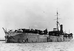 Enfin, le premier porte-avions britannique construit en tant que tel, le HMS Hermes de 11 000 tonnes environ, lancé en , était encore en travaux au moment de la conférence de Washington[11]. Ces deux bâtiments avaient une caractéristique nouvelle, un îlot à tribord incorporant la passerelle et les conduits de fumée des chaudières.