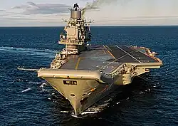 - ↑ Pour 250 mètres de longueur et 32 mètres de largeur plus lourd que les porte-avions des autres marines alors en service