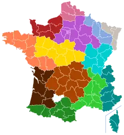 En 1960, le décret 60-516[7] du 2 juin se rapporte (pour la métropole) aux limites des régions sur lesquelles ont été instaurés les programmes d'action régionale pour en faire des circonscriptions d'action régionale (avec quelques modifications : les régions Alpes et Rhône sont fusionnées, les Basses-Pyrénées passent de Midi-Pyrénées à l'Aquitaine, et les Pyrénées-Orientales de Midi-Pyrénées au Languedoc)[8]. Désormais, ces territoires ne sont pas seulement les terrains de programmes économiques, mais c'est l'ensemble des administrations qui doivent calquer leurs subdivisions sur ces circonscriptions — elles pourront éventuellement construire au cas par cas des unités administratives couvrant plusieurs régions ou au contraire subdivisant une région en plusieurs parts, mais les limites de ces unités doivent coïncider avec des limites de régions.