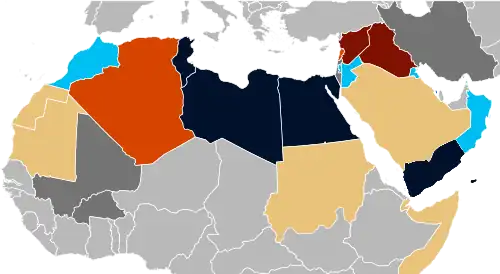 La période de décolonisation du Moyen-Orient s'étend de 1922 (Égypte) à 1971 (Bahreïn, ÉAU et Qatar)[4], marquée par des révoltes civiles et militaires, elle se traduit sur la scène internationale par des mouvements de grande ampleur tels que la naissance de mouvements panarabes (Nasser est l'une de ses figures majeures) et rapprochements politiques (Fédération arabe d'Irak et de Jordanie, République arabe unie et Union des Républiques arabes) le conflit israélo-arabe et les guerres et conséquences économiques internationales sur le cours du pétrole ou encore la crise du canal de Suez impliquant les deux blocs de la Guerre froide. Durant cette période, certains États se rapprochent du camp occidental, d'autres du bloc de l'Est, d'autres choisissent de ne pas s'aligner. Cette différence de positionnement ainsi que la montée des tensions communautaires entre Chiites et Sunnites et l'instabilité des cours du pétrole – devenu un enjeu géostratégique pour les Occidentaux – est à l'origine des trois guerres du Golfe et du dualisme grandissant entre l'Iran et les pays arabes menés par l'Arabie saoudite[5].