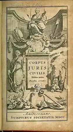 - ↑ Le Digeste est une des quatre parties du Corpus Juris Civilis qui est la plus grande compilation du droit romain antique. Le premier volet du corpus date de 527, la seconde version de 534. Le Digeste est une compilation des consultations des jurisconsultes de diverses époques de la République et de l’Empire, il s’attache à harmoniser et gommer les divergences de positions entre les différents juristes. Portail Numérique d'Histoire du Droit - Corpus Juris Civilis