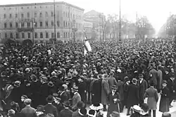 À la fin de la Première Guerre mondiale, c'est un mouvement pacifiste renouvelé qui s'impose. Il espère tenir une place au sein du monde politique et cela d'autant plus que les Quatorze points de Wilson correspondent au programme minimum défini par les pacifistes à La Haye[134], notamment en ce qui concerne le droit des peuples à disposer d'eux-mêmes et l'importante des minorités. Au sein du mouvement pacifiste et notamment au sein du Bund, on a discuté du renforcement de la démocratie allemande, du rôle du parlement ou de la modernisation du droit électoral. Lorsque Guillaume II s'exile aux Pays-Bas, il ne se trouve aucun pacifiste pour le soutenir. La thèse de guerre défensive qu'il avait soutenue n'était que propagande.