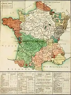 Pays de production, la Franche-Comté (non française sauf épisodiquement jusqu'en 1678) n'est pas soumise à la vraie gabelle royale sur le sel créée en 1343 par le roi de France Philippe VI qui transforme en monopole d’État le commerce du sel et institue un lourd impôt indirect sur sa consommation. En 1680, Colbert, contrôleur général des Finances, crée cinq grandes Fermes chargées de percevoir les impôts : l'une d'elles est la Ferme du roi ou gabelle qui paie au trésor royal une somme définie et se rembourse en percevant une taxe sur le sel consommé par les sujets du royaume qui est divisé en six « pays » de gabelle avec des réglementations différentes.