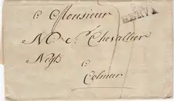 | Ville | Marque port dû | Marque port payé | Marque déboursé | Date | remarques |