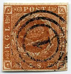 Le premier timbre danois est émis en 1851. Il est non dentelé de couleur brun et d'une valeur faciale de 4 skilling. Plusieurs tirages ont eu lieu entre 1851 et 1854.
