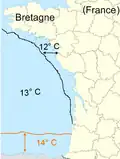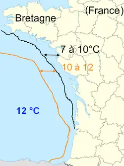 Le , la température de la surface de la mer est de 12 °C[8] à Saint-Nazaire et 14 °C[8] à Mimizan. Le la température de la surface de la mer la plus froide dans le golfe de Gascogne est de 11 °C