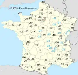 Le record est −36,7 °C en 1968 à Mouthe. Il a fait −13,9 °C à Paris parc Montsouris en .