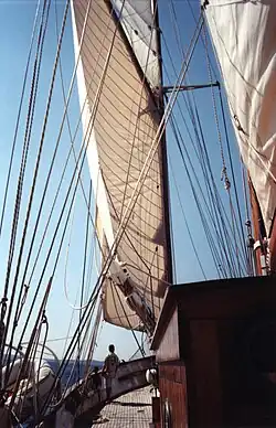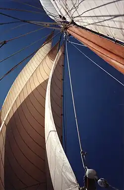 - Sur le grand-mât : une grand-voile aurique et un flèche (24 m de hauteur par rapport à l'eau).