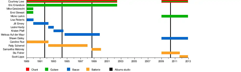 - Courtney Love – chant, guitare rythmique (1989–2002, 2010–2012)