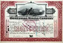 La fondation de la société Homestake Mining Company eut lieu en 1876, trois ans après la découverte du gisement et en 1879 la cotation à la bourse de New-York précède d'un an la création en 1880 de la première banque "National Bank des Black Hills" à Lead pour la mine. L'un des premiers actionnaires fut le futur milliardaire américain George Hearst.