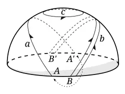 Sur la sphère ordinaire , le cycle b du diagramme peut être réduit au pôle, et même le grand cercle équatorial a peut être réduit de la même manière. Le théorème de Jordan montre que tout cycle arbitraire comme c peut être réduit de la même manière à un point. Tous les cycles de la sphère peuvent donc être transformés en permanence et appartiennent à la même classe d'homologie. On dit qu'ils sont homologues à zéro. Découper une variété le long d'un cycle homologue à zéro la sépare en deux composantes ou plus. Par exemple, découper la sphère le long de a produit deux hémisphères.
