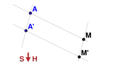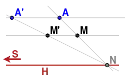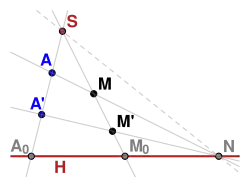 - Soit M un point de P(E) distinct de S et hors de H et de la droite (SA). Toutes les droites passant par S sont globalement invariantes car elles intersectent H et passent donc par deux points fixes. Soit N le point d'intersection de la droite (AM) et de H. Ce point étant fixe l'image de la droite (AM) est la droite (A'N). L'image M' de M est donc à l'intersection de la droite (A'N) et de la droite (SM), toutes deux coplanaires, ce qui détermine M'.