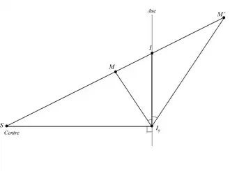 Notons le projeté orthogonal sur l'axe du centre de l'homologie harmonique. L'image d'un point par l'homologie est le conjugué harmonique de pour le segment où est le point d'intersection de la droite avec l'axe. D'après les propriétés des bissectrices de deux droites, la droite est la bissectrice intérieure du triangle , d'où construction de la droite comme symétrique de la droite par rapport à l'axe[7].
