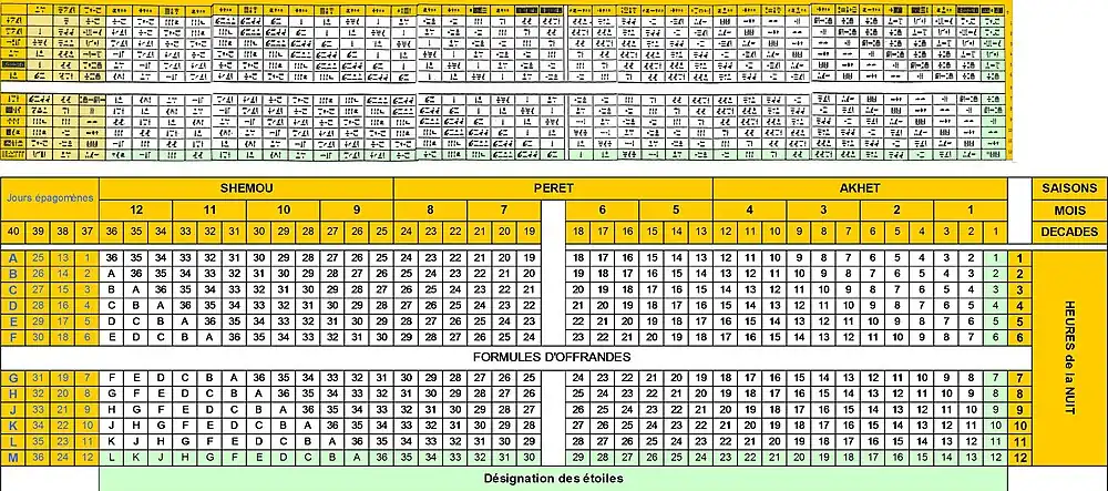 Une telle table se compose de treize lignes découpées en quarante colonnes. Chaque colonne correspond, de la droite vers la gauche, aux trente-six décades de l'année, les trois dernières colonnes synthétisant les noms des trente-six décans du ciel nocturne, et la dernière colonne décrivant les décans observés durant les jours épagomènes.