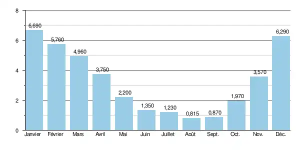Ces mesures ont été effectuées pour la région wallonne en territoire frontière Wallonie-France. Le débit moyen de la rivière mesuré à Flohimont, commune de Fromelennes[5], entre 1992 et 2001 est de 3,4 m3/s. Durant la même période on a enregistré :
