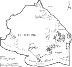 La ville de Houma est traversée par le bayou Terrebonne qui se divise en plusieurs bras. Le bras principal, continue de porter le nom de bayou Terrebonne et poursuit son cours jusqu'au golfe du Mexique et la baie de Terrebonne. Deux autres bras secondaires s'éloignent du lit principal. Le premier dès le centre-ville de Houma sous le nom de bayou Grand Caillou et le second à la sortie immédiate orientale de la ville de Houma, dans le quartier de "Presquile" sous le nom de bayou Petit Caillou en direction de la localité voisine de Bourg.