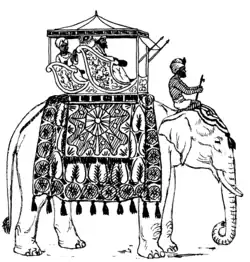 Un howdah, tel que ceux utilisés par les princes de l'Inde, est un siège de bois formant deux compartiments, recouvert de feuilles d'argent et d'or, et fixé solidement sur le dos de l'éléphant. Le compartiment avant, qui offrait plus d'espace pour les jambes et une sécurité accrue offerte par une feuille de métal servant de protection, était en principe destiné aux rois ou aux princes ; le compartiment arrière, plus petit, hébergeait des gardes du corps de confiance.