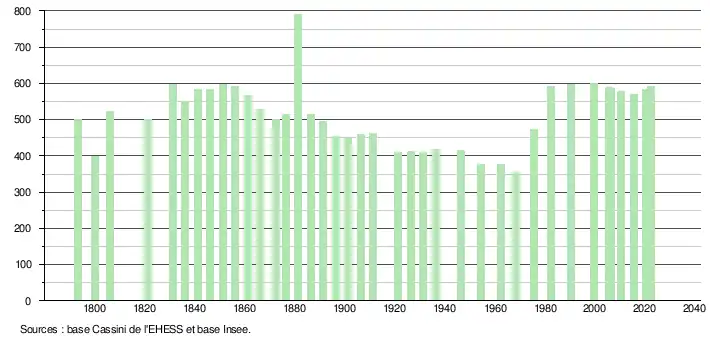 L'évolution du nombre d'habitants est connue à travers les recensements de la population effectués dans la commune depuis 1793. Pour les communes de moins de 10 000 habitants, une enquête de recensement portant sur toute la population est réalisée tous les cinq ans, les populations de référence des années intermédiaires étant quant à elles estimées par interpolation ou extrapolation[20]. Pour la commune, le premier recensement exhaustif entrant dans le cadre du nouveau dispositif a été réalisé en 2005[21].