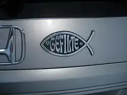Plaque humoristique apposée sur une voiture, relative au plat emblématique ashkénaze du gefilte fish.