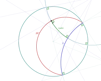 Construction, dans le disque de Poincaré, de l'hypercycle HC d'axe L passant par P (le rayon de HC est le segment de droite en vert)