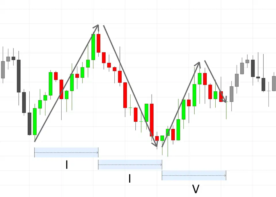 - une vague V : il s'agit d'une vague avec deux segments, composée d'une impulsion (une vague I) et d'un mouvement correctif ;