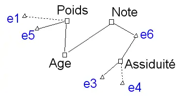 - Par rapport au schéma précédent, le lien entre note et assiduité a disparu, remplacé par les liens (Note,e6) et (Assiduité,e6) . Il était donc redondant : l’élève e6, très assidu et bien noté, explique à lui tout seul le lien (Note,Assiduité).