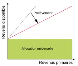 Lorsque l'allocation est couplée à un impôt sur le revenu à taux unique, le taux d'imposition effectif des ménages est progressif, sans effet de seuil. Le taux d’imposition moyen sur les revenus est de plus en plus élevé, la limite maximale de ce taux moyen étant le taux nominal de l'impôt.