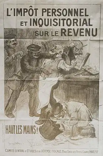 Les socialistes soutiennent l'établissement d'un impôt sur le revenu individuel et progressif mais entendent le substituer au système d'imposition des « quatre vieilles » (contribution financière, personnelle mobilière, patentes, et portes et fenêtres), système jugé inégalitaire puisqu'il n'est pas indexé sur le niveau de revenu de chaque citoyen[13]. Le projet est vigoureusement combattu par les principaux journaux (Le Temps, Le Matin, Le Figaro)[13]. Adopté par la Chambre des députés le , mais bloqué par le Sénat conservateur, le projet Caillaux n'est finalement voté que le par la Haute Assemblée dans le cadre de l'effort de guerre[14], après avoir été largement allégé par la majorité conservatrice qui représente les agriculteurs et les classes moyennes de l'industrie et du commerce résolument hostiles à toute forme d'impôt sur le revenu[réf. souhaitée]. Le président de la République Raymond Poincaré obtient de la majorité parlementaire, hostile à la guerre, qu'elle renonce à abroger la loi de prolongeant le service militaire à trois ans contre l'adoption de l'impôt sur le revenu, qui est voté par l'Assemblée nationale le [15]. Entre-temps, Joseph Caillaux s'éleve avec vigueur contre la tentative d'autres députés de mettre en place un impôt spécifique sur le capital[16]. En désaccord, selon le ministère des finances, la création de l'impôt sur le revenu ferait suite à la réforme de l'imposition foncière et serait sans aucun lien avec l'effort de guerre, ce dernier faisant l'objet de services publics gratuits pour les militaires (postes), d'une dévaluation de la monnaie et d'émission de bons du trésor pour moderniser le système fiscal de l'État[17].