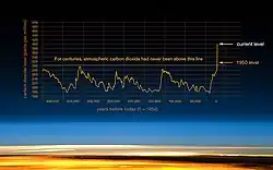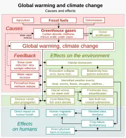 Les termes anthropique et anthropogénique s'appliquent à un effet ou un objet résultant de l'activité humaine. Le terme a été utilisé pour la première fois au sens technique par le géologue russe Alexey Pavlov, et l'écologiste britannique Arthur Tansley l'a été utilisé pour la première fois en anglais en référence aux influences humaines sur les communautés végétales climaciques[16]. Le spécialiste de l'atmosphère Paul Crutzen, prix Nobel de chimie 1995, a popularisé le terme « Anthropocène », néologisme forgé dans les années 1980 par l’écologiste américain Eugene F. Stoermer[17],[18]. Ce mot est parfois réduit au sens de pollution produite par l'activité humaine depuis le début de la révolution verte, mais s'applique logiquement au sens large à tous les principaux impacts humains sur l'environnement[19],[20],[21]. Bon nombre des actions entreprises par les humains qui contribuent à rendre l'environnement plus chaud proviennent de la combustion de combustibles fossiles de diverses sources, telles que : l'électricité, les voitures, les avions, le chauffage des locaux, la fabrication de biens ou la destruction des forêts[22].